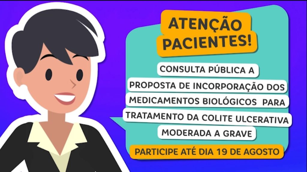 Atenção Pacientes! Participe até dia 19 de agosto da consulta pública a proposta de incorporação dos medicamentos biológicos para tratamento da colite ulcerativa moderada a grave Participe >> https://conitec.gov.br/consultas-publicas