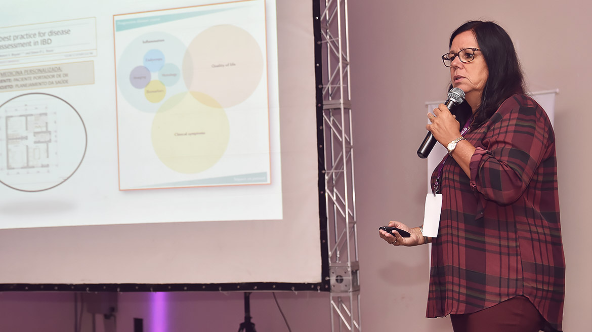 Também é preciso entender os sintomas que o paciente apresenta, número de evacuações diárias, se já esteve ou está em remissão clínica, se está usando alguma medicação e dose, tempo e como ficou com o tratamento… Se for uma criança, precisamos avaliar a curva de crescimento e o desenvolvimento adequado. Somente depois de uma longa conversa e de avaliar os exames e o histórico do paciente será possível planejar os medicamentos, por isso a importância desse olhar diferenciado sobre a doença. “Precisamos ter esse olhar para uma tomada de decisão baseada em critérios clínicos, laboratoriais, radiológicos, endoscópicos e histológicos. Precisamos individualizar o paciente, porque alguns têm a doença leve, outros moderada e outros quadros graves”, ensinou.