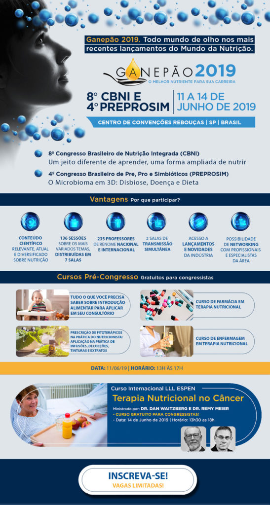 Na edição 2019, realizaremos o 8º Congresso Brasileiro de Nutrição Integrada – CBNI, com o tema “Um jeito diferente de aprender, uma forma ampliada de cuidar” e o 4º Congresso Brasileiro de Pre, Pro e Simbióticos – Preprosim, com o tema: “O Microbioma em 3D: Disbiose, Doença e Dieta”.