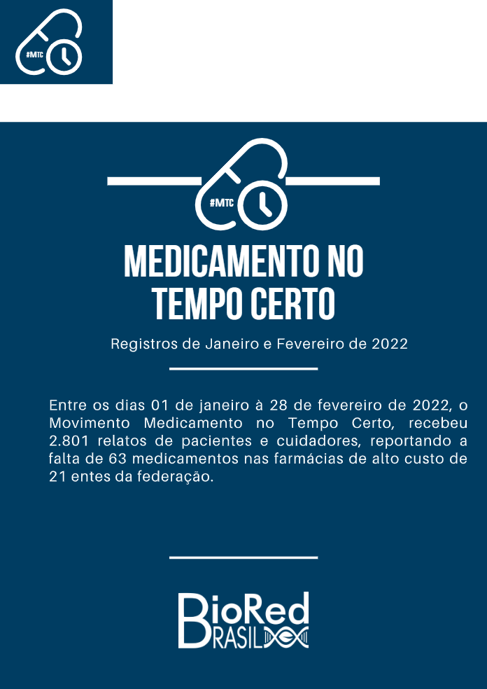 Entre os dias 01 de janeiro a 28 de fevereiro de 2022, o Movimento Medicamento no Tempo Certo recebeu 2.801 relatos de pacientes e cuidadores, reportando a falta de 63 medicamentos nas farmácias de alto custo de 21 entes da federação. Os medicamentos com irregularidades no fornecimento fazem parte dos protocolos clínicos e diretrizes terapêuticas do Ministério da Saúde, 26 destes medicamentos fazem parte do grupo 1A da assistência farmacêutica, sendo seu fornecimento responsabilidade do Ministério da Saúde.