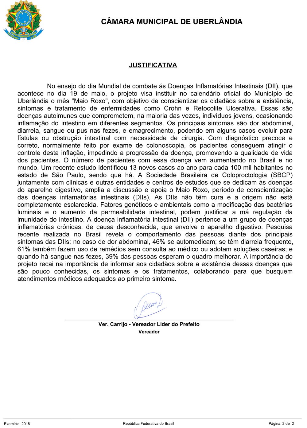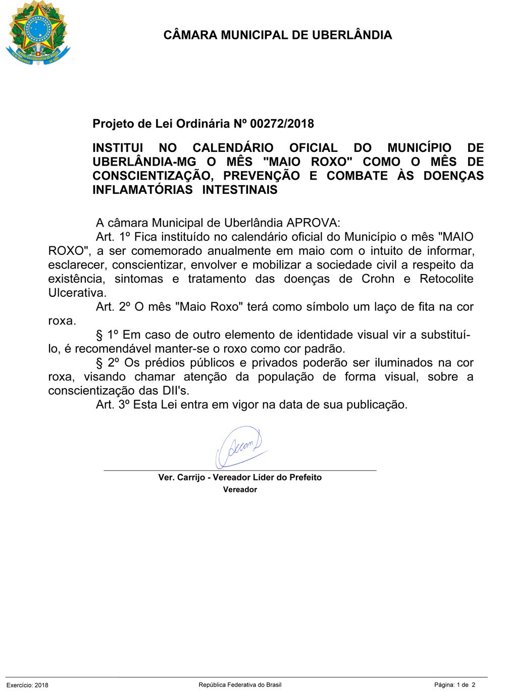 PL 00272/2018 – Institui o “Maio Roxo” no Município de Uberlândia (MG), como mês de conscientização, prevenção e combate às DIIs